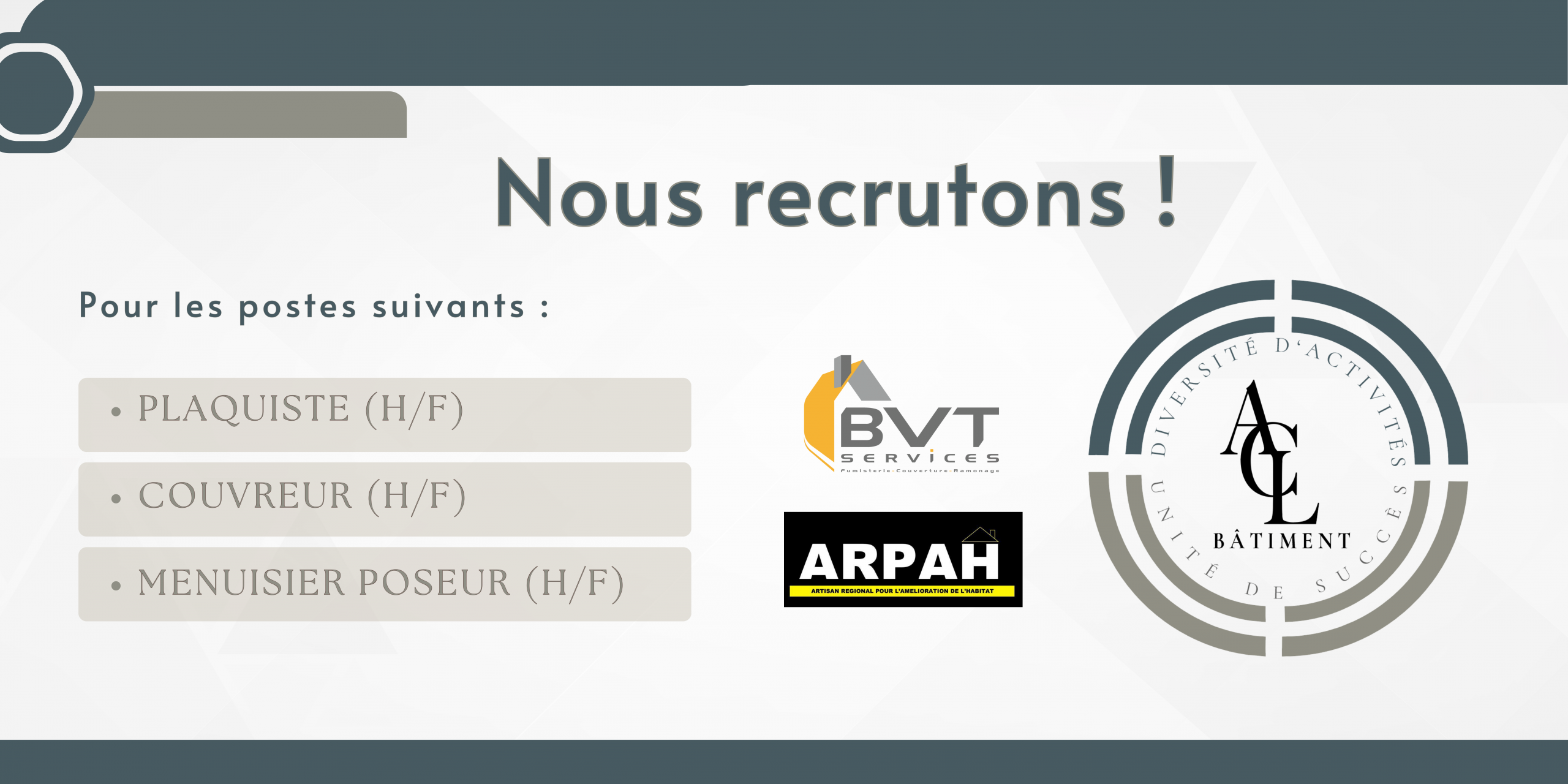 Des postes de couvreur, plaquiste et menuisier sont ouverts pour compléter nos équipes.